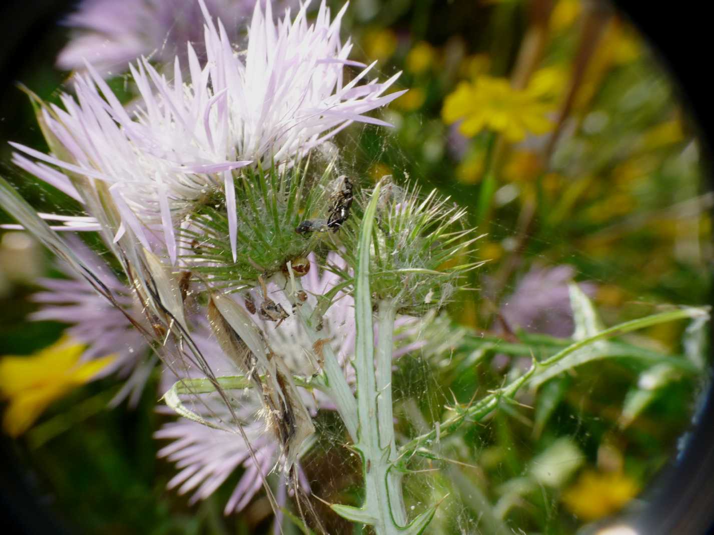 Santa Teresa Gallura, 4-6-2010 Questi piccoli Theridiidae avvolgono di fili un fiore o l'estremità di un rametto e attaccano tutti gli insetti che ci si posano, applicandogli addosso il classico filo con palline collose. A differenza di altre specie, non gettano via le spoglie e le lasciano nella ragnatela, forse a scopo mimetico. Mi sembra Kochiura aulica. E' vero? luigi