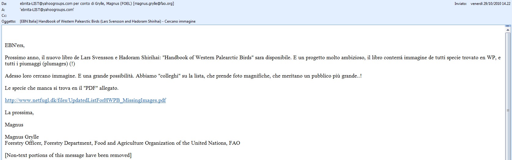 In buona sostanza per l'uscita del nuovo libro di Lars Svensson e Hadoram Shirihai:"Handbook of Western Palearctic Birds", che sarà strutturato con fotografie, sono richieste immagini.