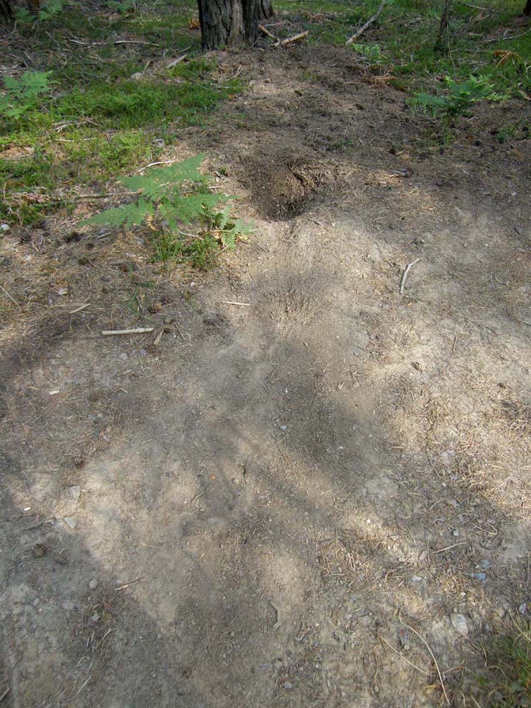 dove adesso c'è il buco c'era una pianta. Il buco non è un giaciglio, nè una tana, nè una latrina e non ci sono traccie recenti di scavo (forse solo sul fondo la terra è piu fresca ma fuori mi sembra bella asciutta. ERGO secondo me li c'era una pianta che a qualcuno piaceva e ha voluto prendersela in tue tempi forse. Prima ha scavato la parte grossa togliendo la terra tutto in torno a cerchio alla pianta poi pero'in un secondo tempo quando la prima terra era già asciutta è tornato (forse attrezzato di piccolo attrezzo) e ha finito il lavoro arrivando alle radici e strappandola. Dopo di che ha trascinato l'arbusto producendo quella traccia e se l'è caricato in spalla per portarselo via. Questo spiegherebbe la buca, l'assenza di traccie e la traccia. Posso anche provare a indovinare che pianta era : un giovane pino   Il mio cervello ha prodotto questa possibile soluzione. se anche questa è da bocciare io archivierei il file come X-file