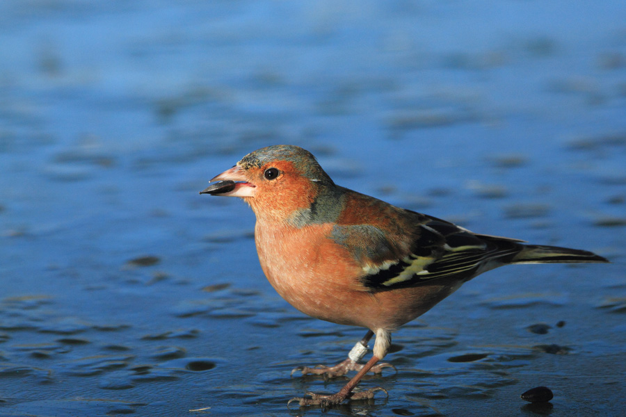 Fringuello inanellato, su lastra di ghiaccio, veramente troppo vicino per consentirmi una diversa composizione dell'immagine.