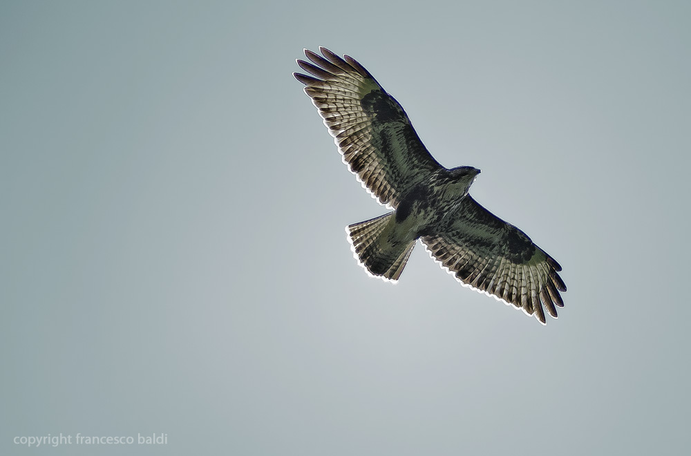 Piumaggio perfetto, tipico del giovane (nell'adulto si iniziano a vedere segni di muta) Petto molto chiaro e gocciolato Banda del bordo alare d'uscita poco marcata (nell'adulto e' nera e ben visibile) Anche la coda manca di bordo nero Per il sesso, nelle poiane e' piuttosto difficile si potrebbe dire che come per quasi tutti i rapaci le femmine sono piu' massiccie e pesanti non essendoci in questa specie un dimorfismo sessuale marcato. Io di piu' non ti so' dire