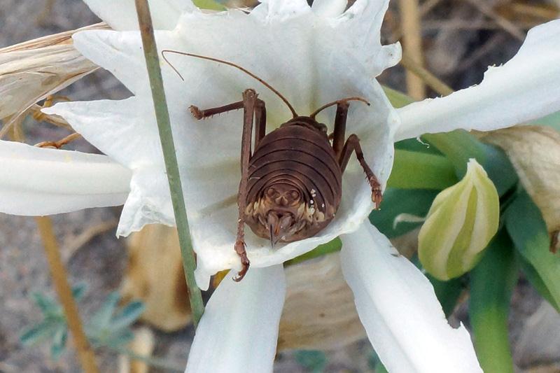 Questa mattina, fotografando sulla spiaggia i fiori del Pancratium maritimum, mi sono accorto che uno di essi era occupato da un insetto.
