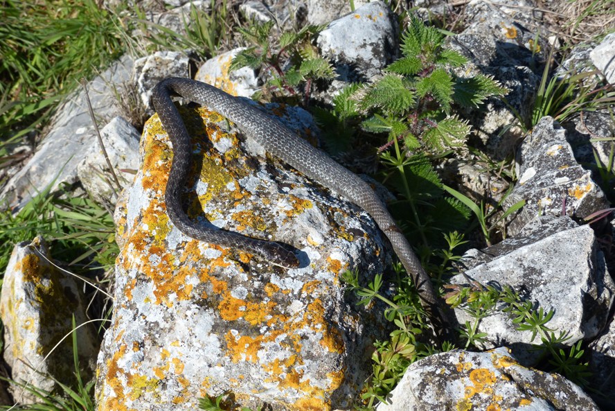 Salve a tutti, sono l'autore delle foto del Biacco. Allego la foto originaria, scattata al biacco morto. Questa è la posizione originaria di come l'ho trovato, (col ventre rivolto all'aria) non aveva ferite, la cosa che ho notato è che aveva la testa completamente bagnata. Nello spostare, per metterlo sulla pietra (foto postate da Ventura) ho notato che gocciolava dalla testa. Queste foto le ho scattate davanti ad una vecchia posta dell'800, in una vallata dove ci sono rapaci...