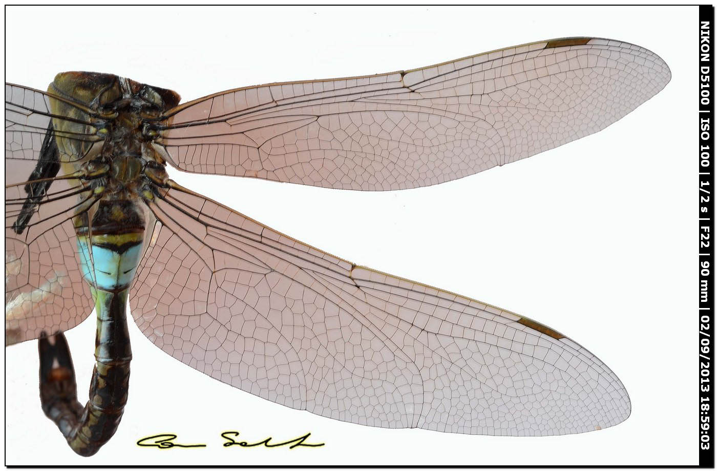 Ciao a tutti, ieri mattina, alle ore 09,30, ho trovato davanti al portone della scuola dove lavoro questo esemplare di Anax parthenope (non sono sicuro che la determinazione sia giusta), il soggetto era morto e con la testa mozzata, l'ho raccolto e portato a casa. La sera ho deciso di fotografarlo per avere dei particolari in modo che possa essere identificato. Con mia grande sorpresa mi sono accorto che sembrava quasi che continuasse a respirare, allora ho fatto un breve video dove si vede benissimo che sembra quasi che continuasse a respirare. Come mi ha spiegato in seguito Maurizio (ghompus) dicendomi: -" non c'è niente di strano, negli insetti il funzionamento dei gangli toracici è largamente indipendente dal controllo di quelli cerebrali, e inoltre il "cuore" tubolare è contenuto nell'addome; in particolare se una libellula, che ha un collo molto sottile che sorregge un capo molto voluminoso, rimane decapitata in un incidente (la cosa più probabile mi sembra un urto secco contro un veicolo), la perdita di emolinfa è molto limitata, e per parecchio tempo il cuore continua a farla circolare e i gangli nervosi continuano a consentire i movimenti involontari, inclusi quelli respiratori".