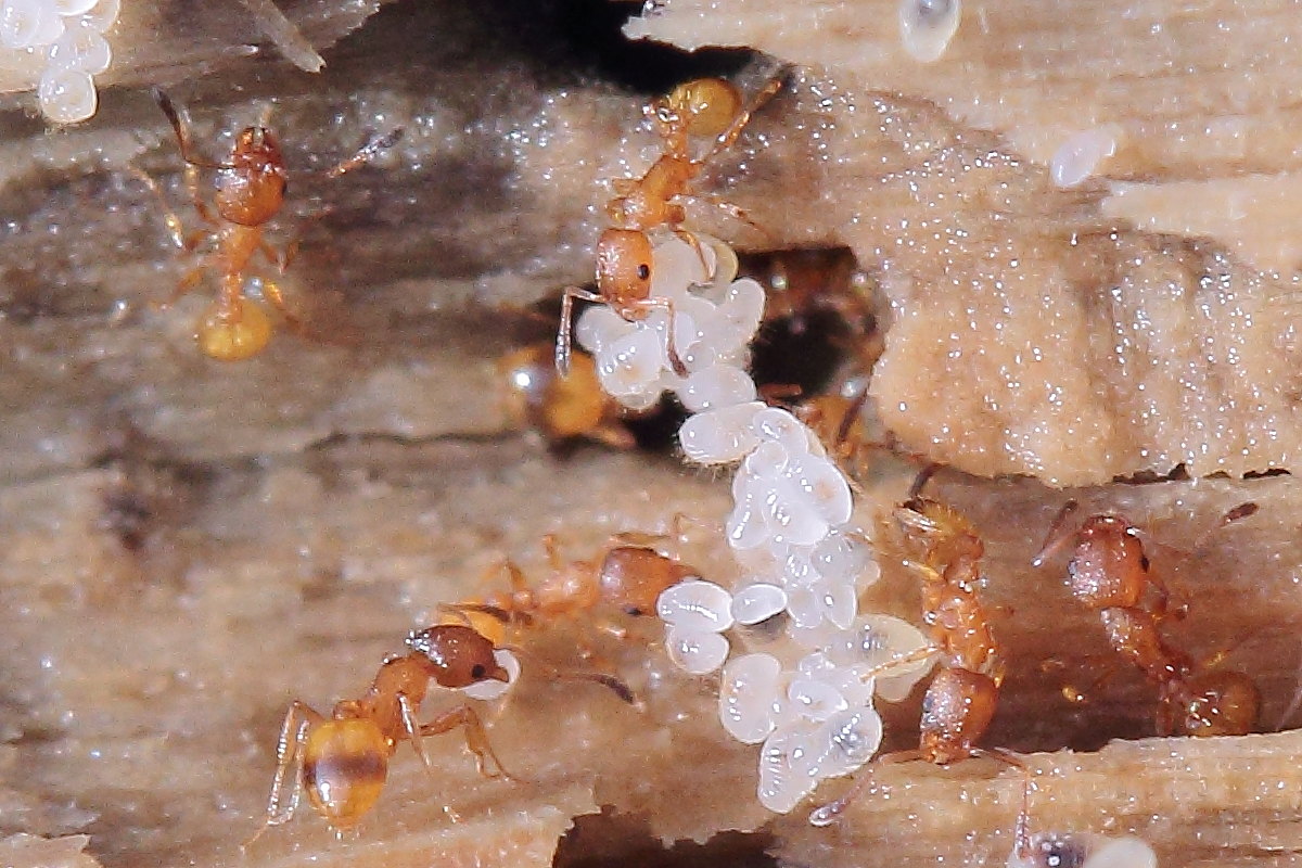 Oggi ho ispezionato una serie di rametti di quercia caduti al suolo per cercare qualche insetto; tra gli altri ne ho trovato uno molto piccolo, lungo circa 10 cm e largo circa 3 cm, imbevuto d'acqua a tal punto che si sbriciolava tra le mani. Tutto avrei pensato fuorchè di trovarci un formicaio (altrimenti non lo avrei aperto); le formiche in questione sono le lillipuziane della famiglia, lunghe circa un paio di millimetri. Dopo aver fatto qualche foto ho richiuso il rametto e l'ho rimesso vove l'avevo trovato.