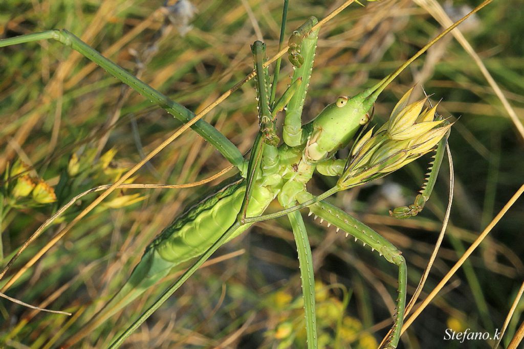 Preda altri ortotteri afferrandoli con le grosse zampe anteriori irte di punte.