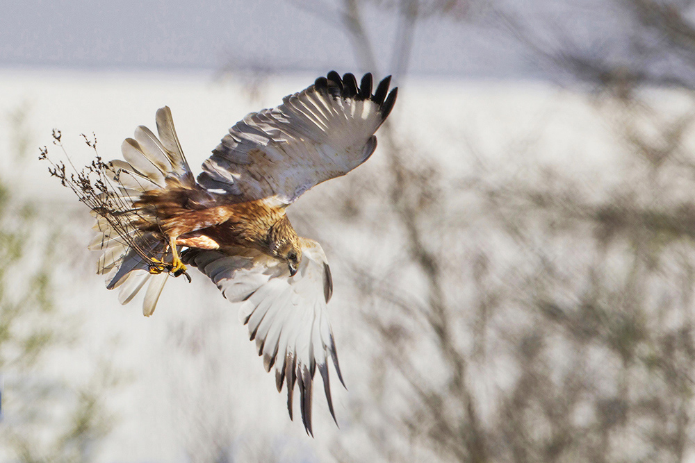 Ciao. Falco di palude durante il trasporto di rami per la costruzione del nido.
