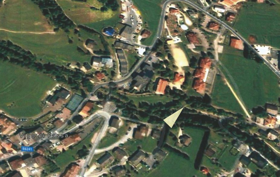 Per concludere, il paese di Vigo di Fassa è attraversato da un torrente, lungo le cui sponde vi è una stretta fascia incolta ed in parte boscosa. Il luogo del ritrovamento (indicato, nella mappa qui sotto dalla freccia gialla) era all’inizio del ponticello che supera il torrente. Stavo fotografando dei fiori, quando mia moglie esclama: “Cos’è quella cosa lì in terra’”. Guardo là dove indicava, e trovo il “mezzo topo”.