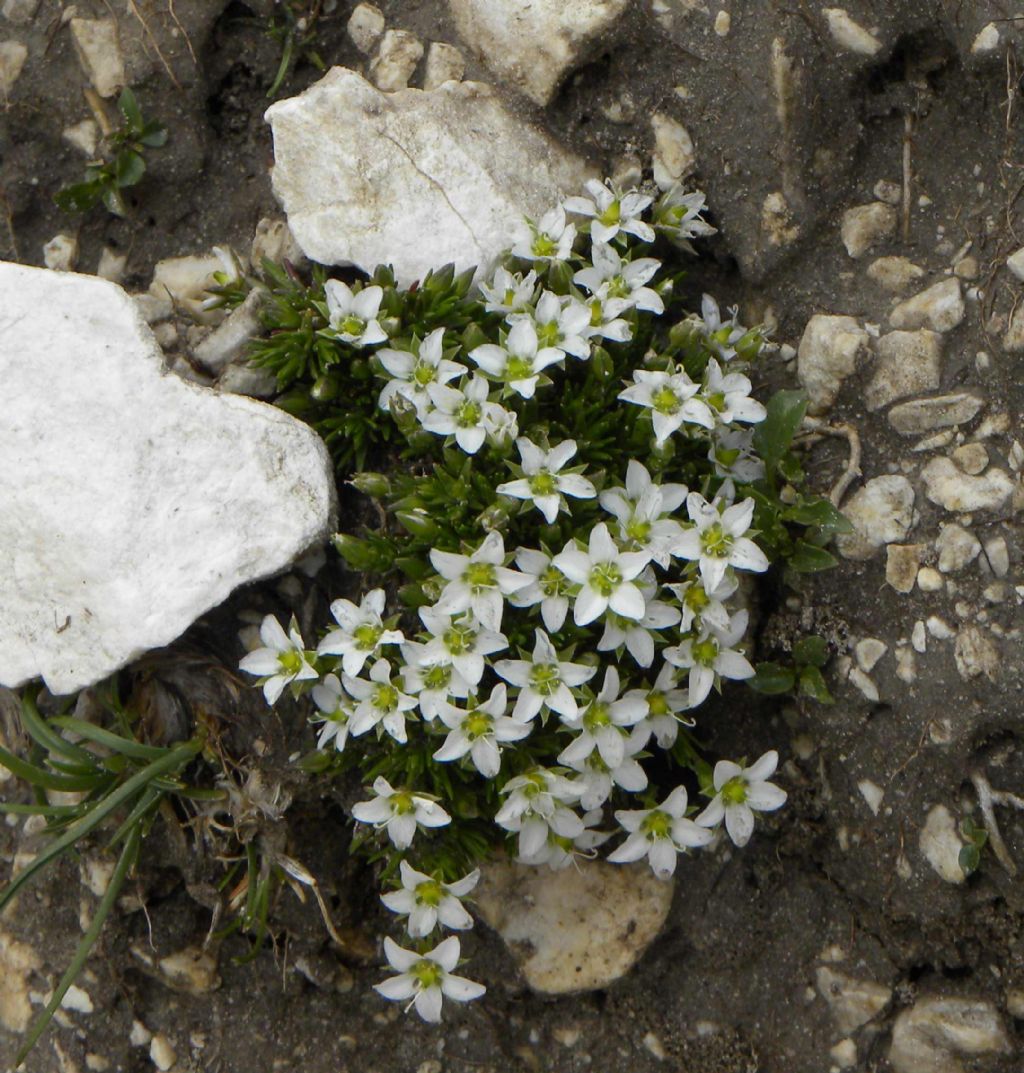 Gli ornitologi hanno i "piccoli uccellini grigi" come grande problema di identificazione; gli appassionati di botanica alpina hanno le "piccole Caryophyllaceae bianche"… Qui noto i petali piuttosto appuntiti e non intaccati, il centro dei fiori verde, le lacinie del calice che non separano completamente tra loro i petali e sono un po' più corte di essi, ma non di molto; le foglie appuntite (non arrotondate) e non aghiformi. Non si capisce quanti fiori ci siano per stelo, né come siano gli steli o i piccioli dei fiori, né se le foglie abbiano peli sui margini, e non riesco a contare il numero di stami, a vederne bene la disposizione o a vedere particolari della struttura del fiore. Non capisco se vi siano parti lignificate della pianta. Sono anch'io incerto tra più specie, ad esempio Arenaria multicaulis (= Arenaria gothica) e Facchinia rupestris (= Minuartia rupestris), ma forse anche altre.