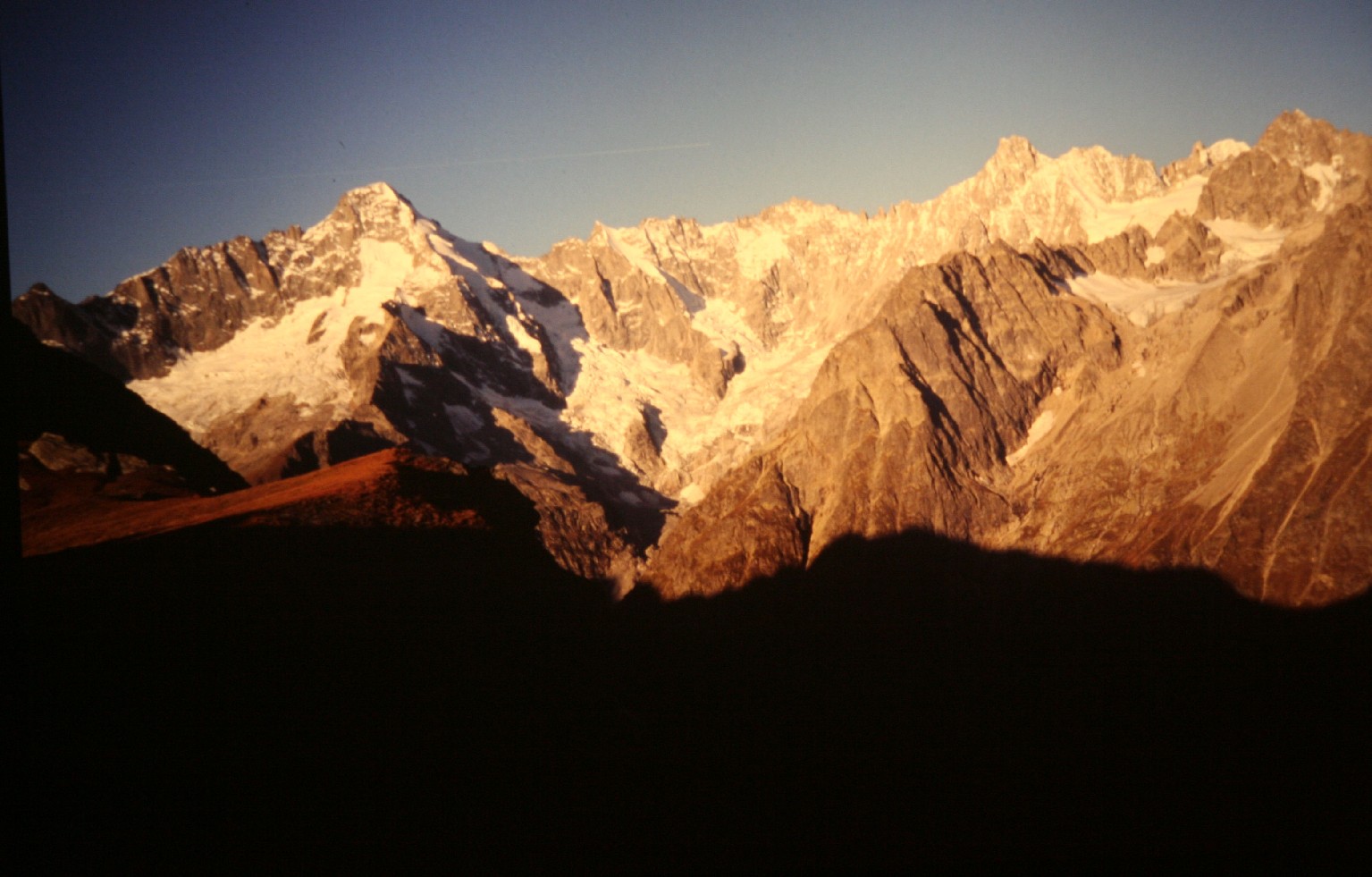 | Allora, ero appena oltre i 3.000 m. , dalla Combe de l'A (Svizzera), affacciato verso la Val Ferret, verso le 8.30 - 9 di mattina del 15 ottobre 2007. Quanto al colore rossiccio ... è accentuato perché si tratta di una foto di una diapositiva. |