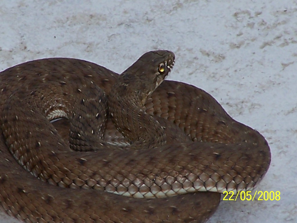 ok, ho ancora dei seri problemi di rocnoscimento!!!...l'ho confrontato con le foto presenti nelle mie ricerche, ma mi riesce ancora difficile distinguere le specie, soprattutto per la variabilità cromatica delle specie stesse, ho provato a confrontare le squame della testa, ma le altre immagini non erano abbastanza nitide...ma se non ricordo male il malpolon è un colubride opistoglifo?!? meno male che il mio cane non si è avvicinato troppo!!era già lì a saltellargli intorno...grazie mille del chiarimento!!e se hai qualche consiglio da darmi per imparare a distinguere i colubridi tra loro, oltre a tanta esperienza, te ne sarei grato!! |