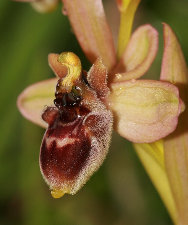 Per me si tratta di Ophrys x sommieri - ibrido tra Ophrys bombyliflora e Ophrys tenthredinifera....infatti nell'ultima foto in basso si intravede sfocata anche una pianta di O. bombyliflora Complimenti....belle immagini!