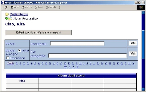 | 2) Appena l'Amministratore avrà creato la tua cartella clicca sulla scritta "Album Fotografico" ti apparirà una pagina come questa (al posto di: Ciao, Rita - Ciao, tuo nome/nick) | ||||