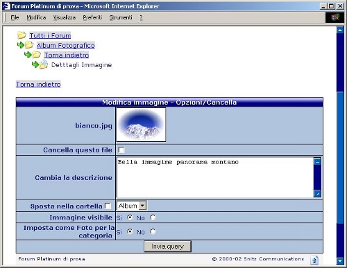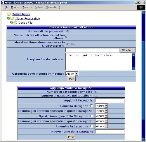 inserire Inserisci la descrizione dell'immagine nell'apposito spazio Scegli la categoria dove inserire l'immagine (inizialmente avrai solo la categoria "Album" a disposizione, più avanti spiegherò come crearne nuove) Clicca Invia - La foto è stata inserita!!! |