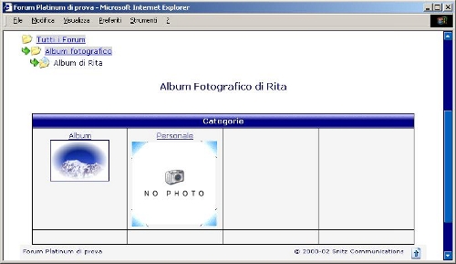 Imposta come foto per la Categoria Cliccando SI e quindi Invia l'immagine diventerà il logo della categoria Se per la categoria non hai scelto nessuna immagine apparirà: "NO PHOTO" Esempio: Foto n. 6 Categoria "Album" con immagine di categoria inserita Categoria "Personale" senza immagine di categoria inserita |