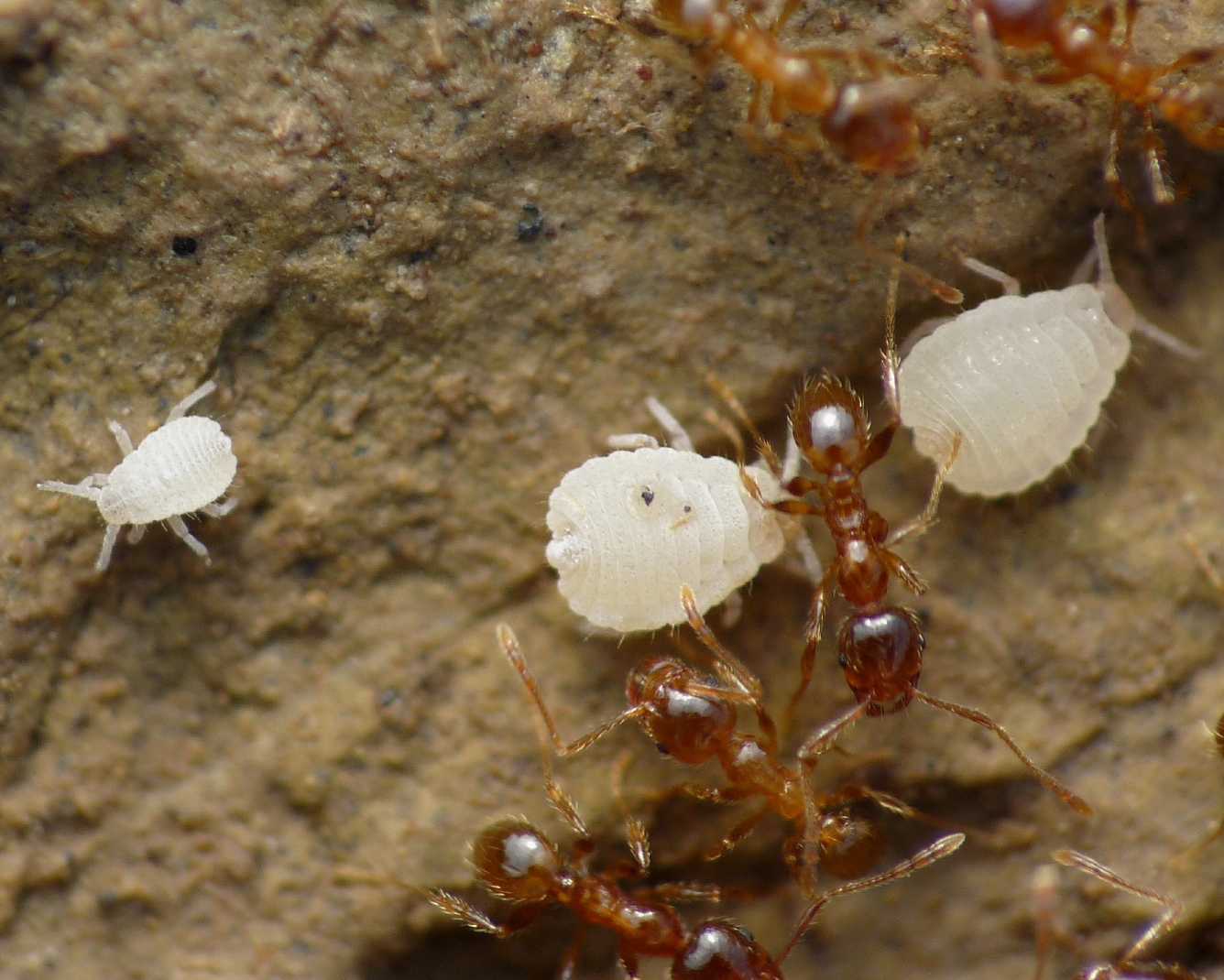 Santa Marinella, gennaio 2010 Sotto una pietra. Questi afidi li ho visti anche in formicai di Tapinoma sp., oltre che in questi di Tetramorium sp. Le formiche a volte, ma non sempre, li trasportano, come fanno con le proprie larve. Penso che in questo caso si tratti di una simbiosi vera e propria, in cui le formiche ci guadagnano la melata. Se non sbaglio, in una delle foto si vede una gocciolina all'estremità dell'addome dell'afide; non so se può essere melata.