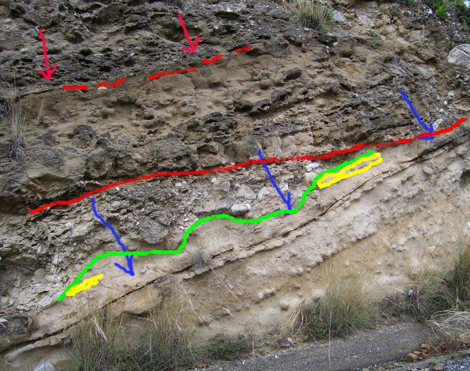Per quanto riguarda la superficie indicata dalla freccia blu, quella è una superficie di strato ed è abbastanza normale che sia intera. Non è detto che eventuali superfici erosive debbano tagliare tutti gli strati. In realtà mi pare che qualche cosa di erosivo si veda alcuni centimetri sopra lo strato indicato dalle freccie blu, dove un altro strato è troncato dal corpo conglomeratico.