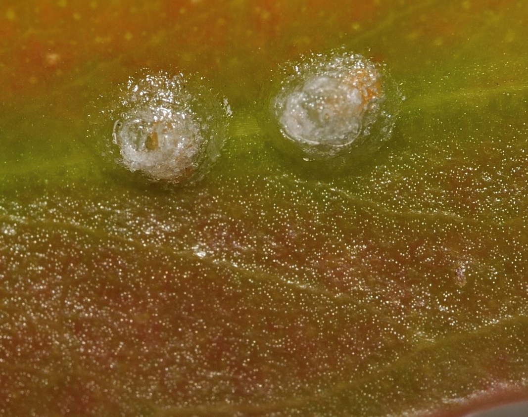Follicoli cerosi (lerps) all'interno dei quali si intravedono le neanidi (color arancio)