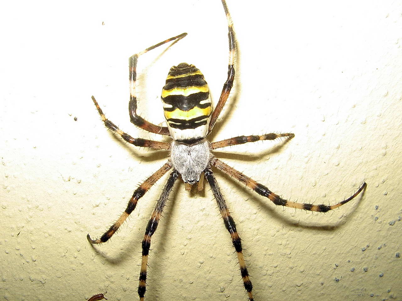 Ciao Luca! Concordo con Alida: anche a me sembrerebbe un Argiope bruennichi che però, come dice giustamente Alida, non ha l'abitudine di frequentare muri e pareti come invece fanno molti ragni più "casalinghi". Non mi convince al 100% la livrea che, nella maggior parte dei casi, dovrebbe essere caratterizzata da striature nere leggermente più fitte e numerose. Non conosco bene questa specie e non vorrei dire una sciocchezza ma presumo che, come avviene per le loro "creazioni" (le ragnatele dei ragni tessitori), anche la loro morfologia sia caratterizzata da una certa variabilità all'interno della specie oppure legata all'area geografica di appartenenza. Direi che come sempre, la miglior cosa da fare sia quella di attendere il parere dei più esperti. Buona giornata!