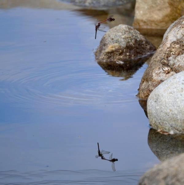 Nella sezione odonati, le foto successive a questa raccontano di una coppia di libellule (Sympetrum striolatum) che, appena dopo l'accoppiamento e varie ovodeposizioni, vede la femmina, abbandonata dal maschio e inutilmente salvata, cedere esausta al suo destino. Qui: Link Anche questo succede al laghetto.