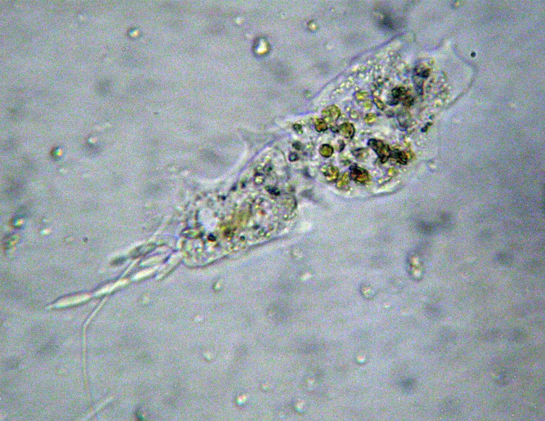 The photomicrograph above shows a Mayorella-species infected by a fungus, probably Amoebophilus simplex. This fungus is specialized in parasitizing mayorellid amoebae, maybe even exclusively Mayorella penardi. Unfortunately, infected amoebae are very rare. I have seen them occasionally and once abundant in a culture. Infection by a fungus has been occasionally recorded on naked amoebae by several observers. Early researchers erroneously recorded conidia protruding from the posterior end of infected amoeba as uroidal filaments, and a new amoeba genus Ouramoeba Leidy, 1874 was established on this basis. Later, Penard (1902) correctly pointed out that these filaments are of parasitic origin. In spite of Penard’s opinion, Cash and Hopkinson (1905) recorded Leidy’s species Ouramoeba vorax Leidy, 1874 in British fresh water. Further records were identified correctly as fungal infections (Mrua, 2008).