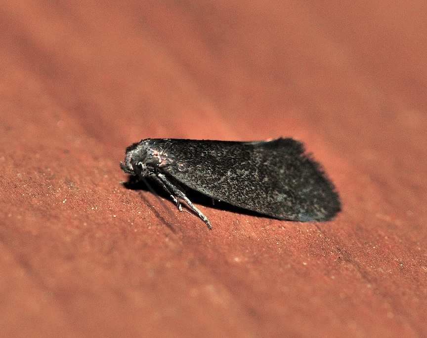 Ieri sera ho visto volare qualcosa attorno alle lampade del giardino e sono uscito con la macchina fotografica ma, ahimé!!!, senza i flash per macro. Sulla parete della legnaia ho trovato questo microlepidottero, ho scattato un paio di foto col flash della macchina ma ne è uscito ben poco.; poi è volata via. Di un bellissimo nero vellutato (il flash inadeguato ha falsato tutto, purtroppo), omogeneo, senza altri colori o macchie, apertura alare apparente sui 12-13 mm, molto nervosa.