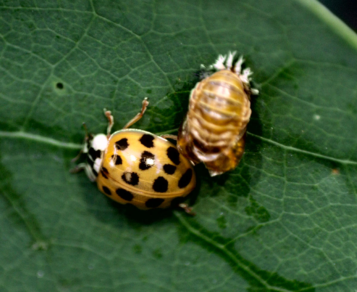 nel punto di attacco di quella che era la pupa, si distingue parte dell'exuvia larvale, con le caratteristiche spine ramificate |