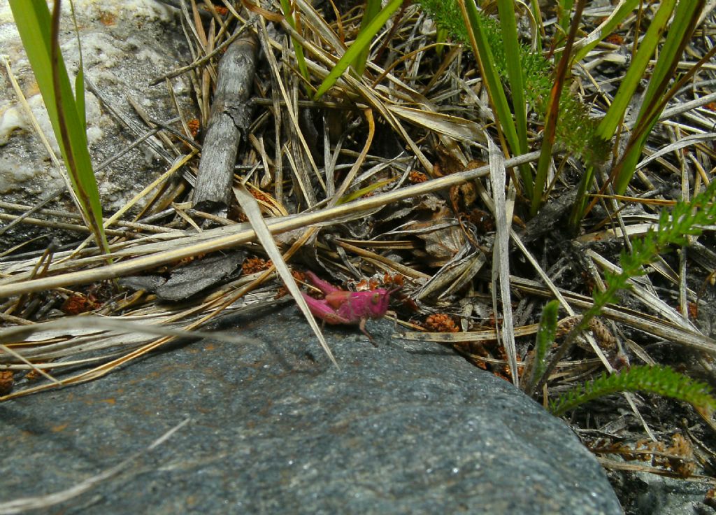 Buongiorno a tutti. Un mese fa un nostro conoscente, Giorgio Percivati, ha trovato questa cavalletta di un bel colore rosa intenso. Chiaramente non sapevo darle un nome. Ho cercato nella vostra Galleria tassonomica, dove ho visto un'immagine interessante di Stenobothrus. Ho anche trovato una discussione relativa ad una forma albina di Pezotettix giornae. Così su due piedi propendevo per la seconda, ma va da sè che mi affido alla vostra esperienza, immagino che le possibilità siano anche altre. Per lo meno, è ben un acridide, no? La zona è: sponde torrente Chisone (sponde prima di limo poi pietre poi vegetazione varia, ovvero prati/incolti/boschi di latifoglie), 1000 m. di quota ca., Comune di Fenestrelle, Provincia di Torino. Grazie per il consulto. Andrea Immagine: