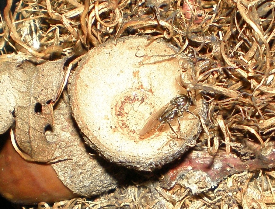 E' un insetto mimetico, poco attivo, e del suo destino poco o niente si conosce. Il suo addome chiamato anche gastro è in gran parte rigondio di uova dalla forma ellittica ma dotati di un lunghissimo peduncolo che li fa assomigliare a spermatozoi. Si può supporre che questa femmina dopo aver speso tante energie per uscire dalla galla ora si appresta a cercare una gemma di una quercia e in essa inoculare con un apposito ovopositore le sue uova. Poi si svilupperanno delle galle ad oggi sconosciute e nella primavera le larve che vi si sono pasciute all'interno si trasformeranno in insetti adulti, maschi e femmine. Dopo le opportune nozze daranno vita deponendo le uova sulle giovanissime ghiande,alle galle che conosciamo.In estate è vegeta e ricoperta di un essudato vischioso poi con l'autunno lignifica e spesso cade al suolo insieme alla ghianda che ha totalmente o in parte inglobato nel suo tessuto. Bisogna attendere febbraio per veder sfarfallare le nuove femmine, sopravvissute all'inverno, alle muffe, agli insetti calcididi parassiti e ai cugini Synerginae inquilini.