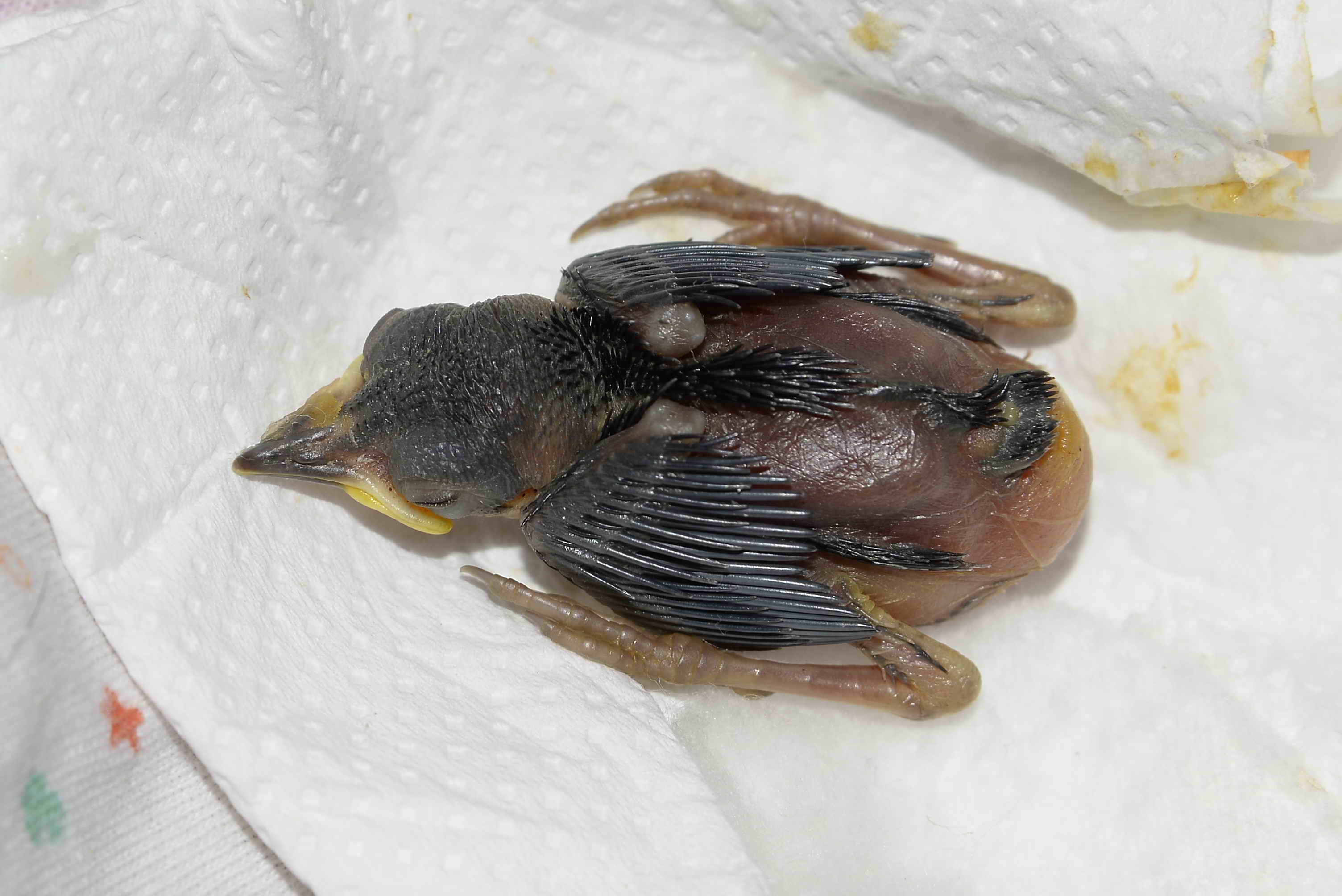 è troppo piccolo per essere edentificato, avrà al massimo 1-2 giorni, per stabilire di chi si tratta dovresti rifotografarlo tra qualche giorno, se sopravive (ripeto è troppo piccolo). dalle foto non si percipesce la misura, ma mi pare abbastanza grande, quindi probabilmente è o uno storno o un merlo o un tordo.