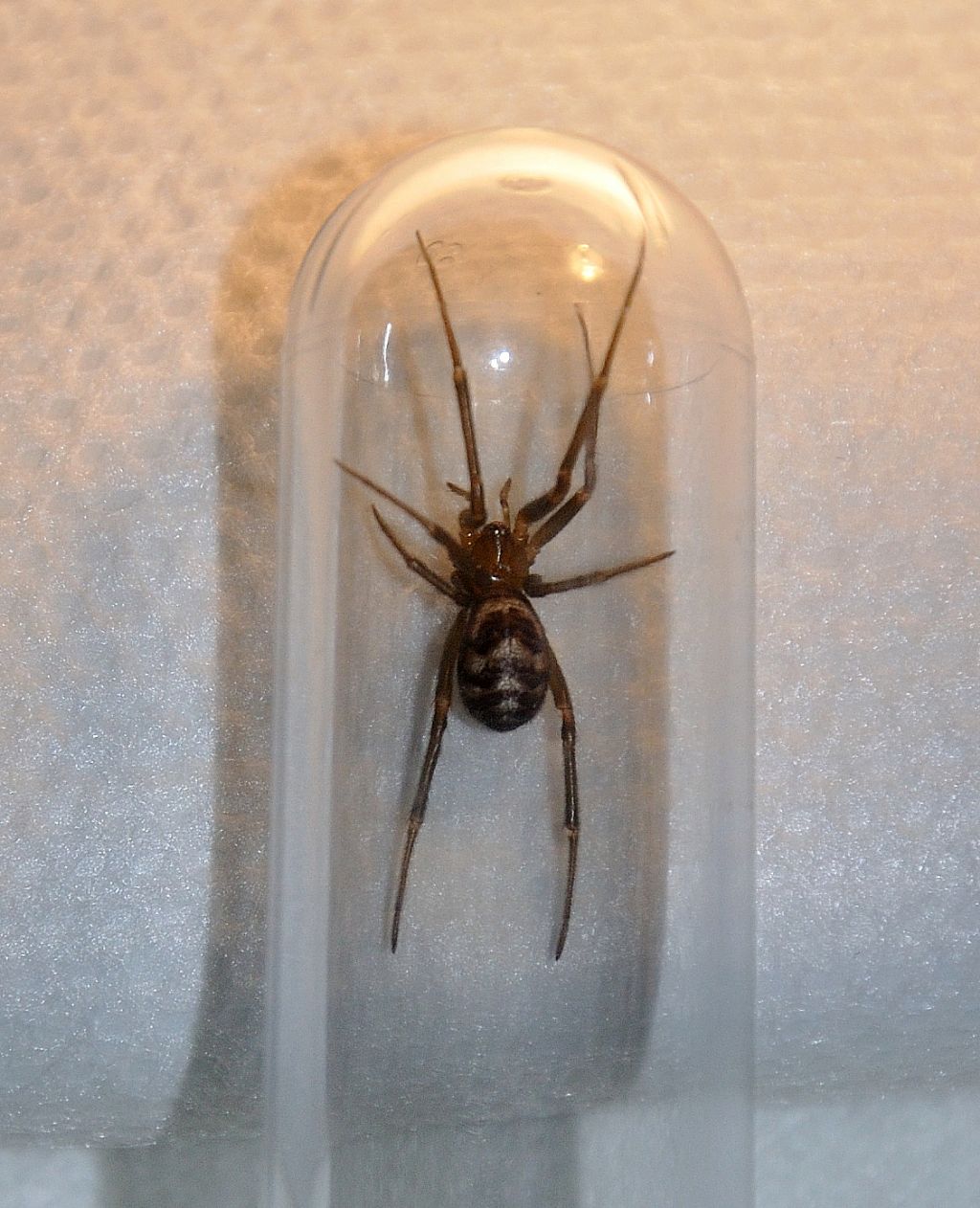 La mia compagna questa notte nel letto si è sentita pungere e si è trovata una coscia una serie di ponfi, come una scia, quasi che l'animale che le ha prodotte abbia morso in sequenza, forse perchè si sentiva in pericolo. Poi, nel bagno, ho trovato questo ragno, la cui foto ora vi posto. Sarebbe bello sapere la sua classificazione, se è autoctono, la sua eventuale pericolosità, anche per capire se c'è relazione tra la reazione cutanea della mia ragazza e la bestiola in questione. Non ho messo un righello a fianco della provetta, comunque la sua lunghezza è circa 2,5 cm. Grazie mille! Immagine: