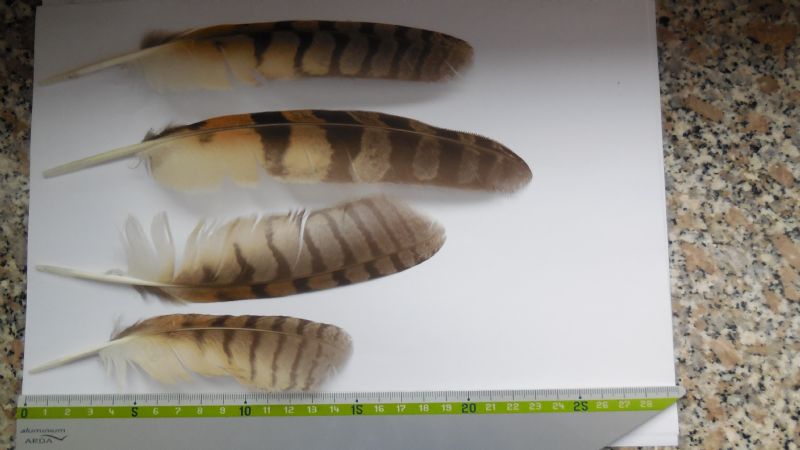 Posto la foto di alcune penne di rapaci che mi sono state regalate da un mio amico e di alcune che avevo già. Le sue sono di gufo comune. Le mie hanno un colore differente ma non riesco a trovare un altro rapace notturno che possa avere un simile piumaggio