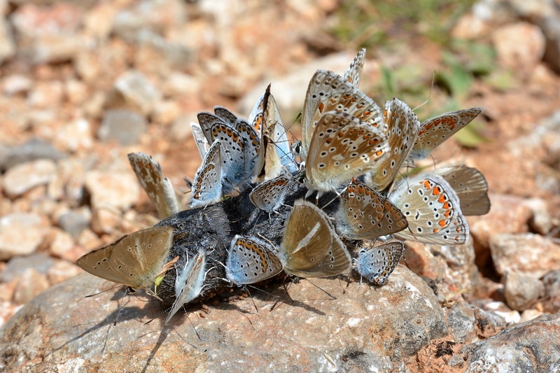 si vedono ( a destra) Polyommatus sp. ( probabilmente icarus ) poi dei Polyommatus coridon, diversi Plebejus, (quasi sicuramente argus), e dei P.damon con la stria bianca ... in fondo anche un Polyommatus(Agrodiaetus) del gruppo dolus
