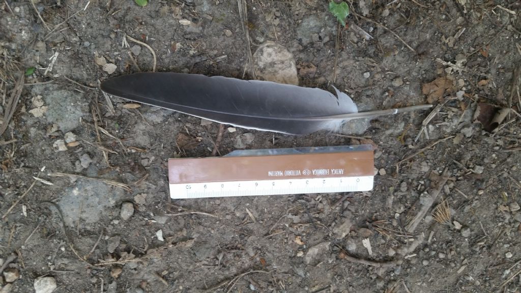 Potrebbe essere di Ghiandaia, ma secondo me è di Colombaccio (Columba palumbus). Ne trovai una quasi identica tempo fa, e dopo diverse ricerche, pensando anch'io che fosse di Ghiandaia, dovetti constatare che effettivamente era di Colombaccio. Comunque non posso darti la certezza, aspettiamo qualche altro parere