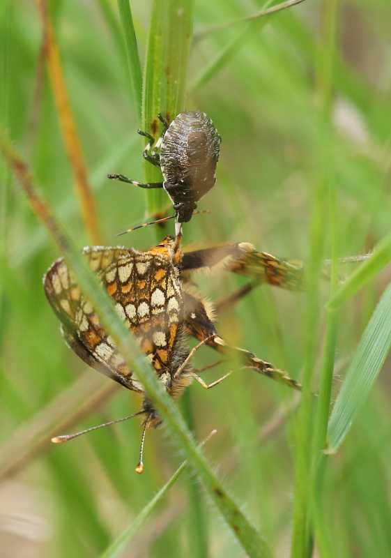 Ciao a tutti, vi propongo una foto dell'amore finito male tra 2 Melitaea cf. aurelia che, troppo impegnate nel "consumare", non si sono accorte dell'arrivo di questo cimice che... ha cominciato a papparsele. Qualcuno mi sa dire di che cimice si tratta? Dai libri non riesco a trovare nulla che ci somigli...