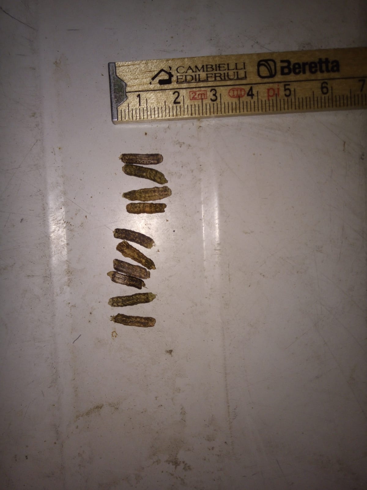 Se non sono di riccio (non ho esperienza diretta) potrebbero essere di ratto anche se io le ho sempre viste nere e leggermente diverse nella forma... il colore magari può essere dato dalle crocchette dei gatti... Le mia è solo un'ipotesi.  |