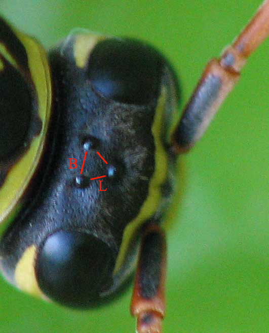 E' proprio per quasto che non ci metterei la mano sul fuoco. La prospettiva a volte inganna ma la distanza tra gli ocelli posteriori (B) è sul mio schermo circa 20 mm. mentre quella tra uno dei posteriori e l'anteriore (L) è circa 16 mm. Quindi un triangolo isoscele e non equilatero, con una modesta differenza di lato: 20/16 = 5/4.