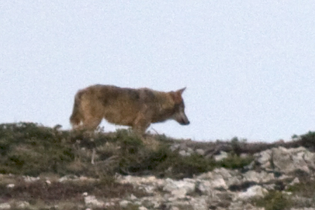 la foto è stata scattata con una canon eos 30D ed un 300 mm + 2X!!! La distanza era davvero tanta: ad occhio nudo non si distingueva ed è soltanto per un eccesso di zelo che, utilizzando un binocolo, mi sono accorto che quel "paletto" così lontano in realtà era un lupo!!!