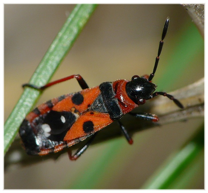 La macchia apicale della membrana mi sembra piuttosto piccola e le macchie scure del pronoto si congiungono a formare un'unica banda nera.