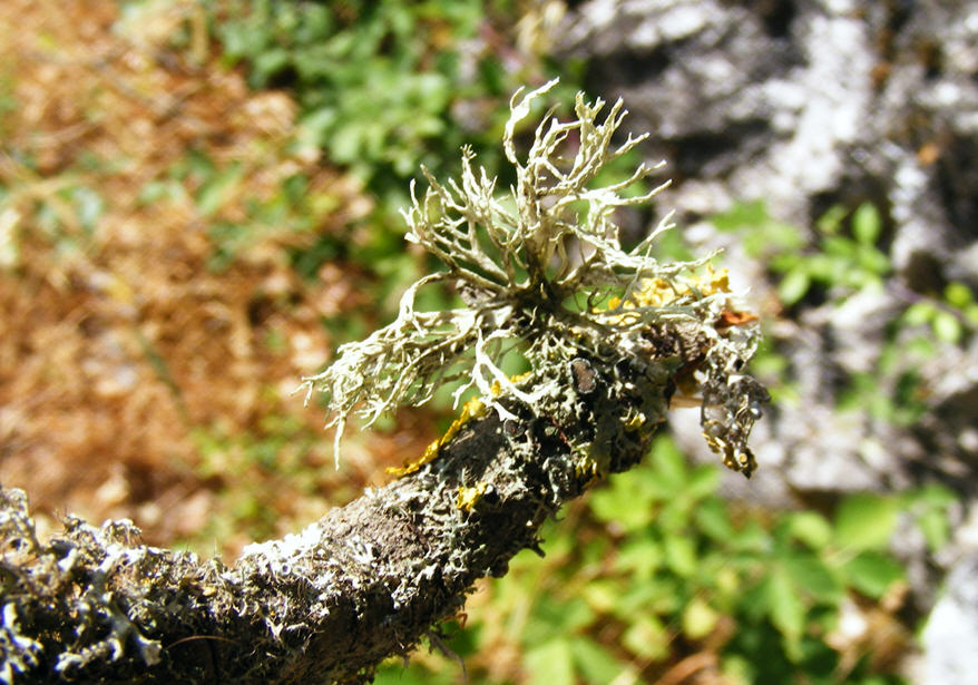 La luce è un po' strana, ma se avesse la faccia inferiore bianca sarebbe probabilmente una piccola Evernia prunastri.... Altrimenti una qualche Ramalina,
