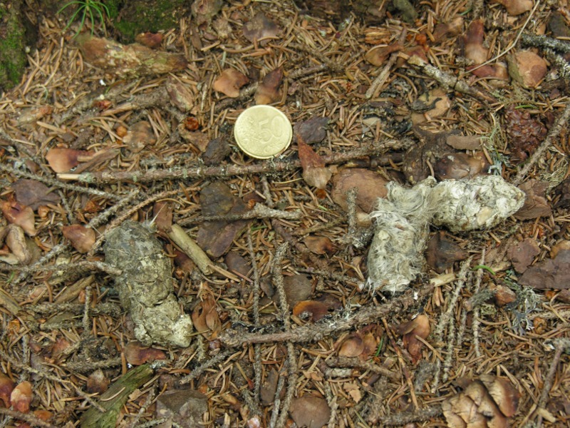 Non ho mai visto fatte di lince (in diretta ) e vedendo le immagini non sapevo che ipotesi fare; ... escluderei la volpe sia per le acute osservazioni di Pardus ... sia (se sono due framenti di uno stesso escremento ... come sembra) .. una incompatibilità di forma e dimensioni. A meno di non considerare qualche "strano" cagnollo, .... non mi viene in mente nessuna ipotesi migliore di ... lince? Ciaoo.