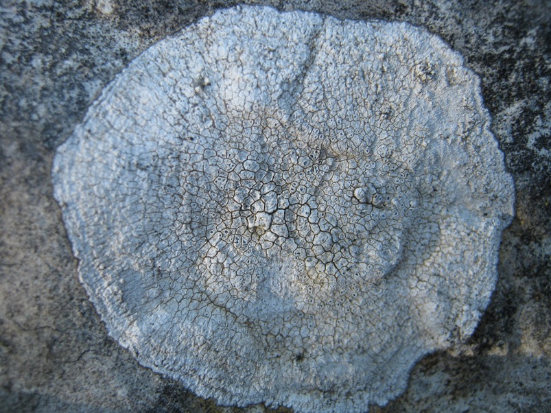 1. Aspicilia calcarea, tallo biancastro, apoteci incrostati, spesso per tre nelle areole.
