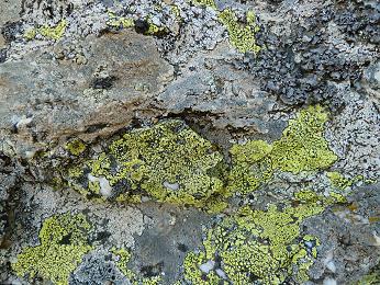 Ciao Rondinedda, se ti riferisci al "lichene giallo" è sicuramente del gruppo di Rhizocarpon geographicum, ma siccome esistono alcune specie molto simili distinte principalmente da caratteri microscopici (come le spore) è difficile arrivare ad una determinazione più precisa. Nella tua foto poi c'è un'intera comunità con almeno 5-6 specie diverse. Quella grigia in alto a destra dovrebbe essere una Umbilicaria; qua e là nella roccia ci dovrebbero essere delle Aspicilie e forse qualche altro Rhizocarpon... tutto un mondo insomma. Se ti piace fotografare, prossimamente prova a fare qualche macro più dettagliata: scoprirai che una diversità su quelle rocce davvero impensabile. Ciao ciao, Poli