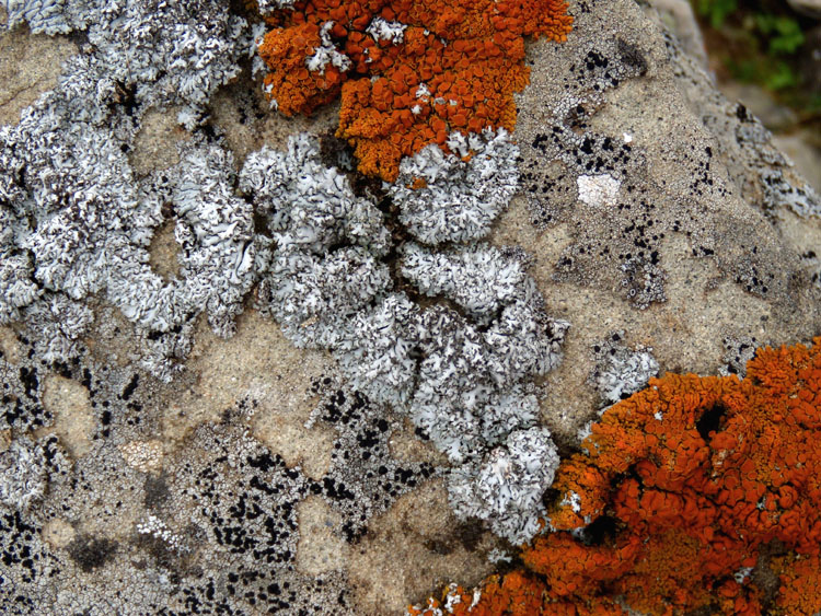 Xanthoparmelia sp. (cortex K-) Brodoa intestiniformis (cortex K+ giallo, atranorine) e finalmente abbastanza poco in un certo limiti a Physcia tribacia (cortex K+ giallo, atranorine)...ma quest'ultimo e il solo ad adattarsi ad un substrato calcareo ... Allora non so. Altre proposte forse ?