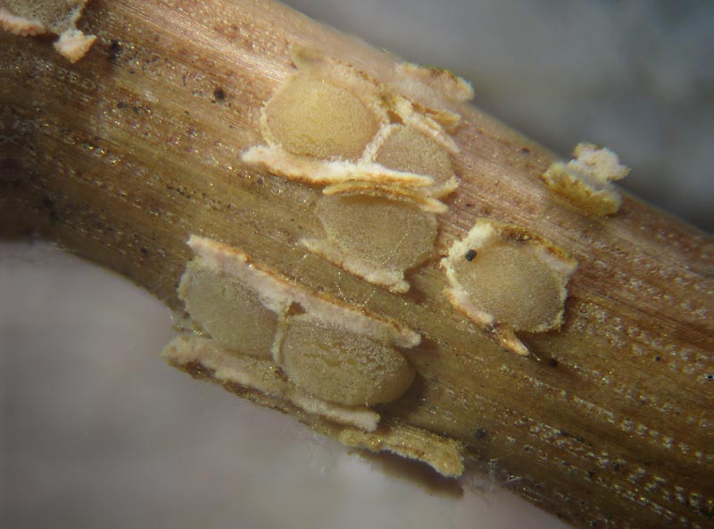 Probabile Naemacyclus minor o minus a seconda degli autori, per la forma arcuata delle spore che mi sembra di intravvedere... sarebbe meglio conoscerne la misura. Lophodermium pinastri e L. seditiorum, sempre su aghi di pino. sono più scuri e con spore più sottili e non curve.