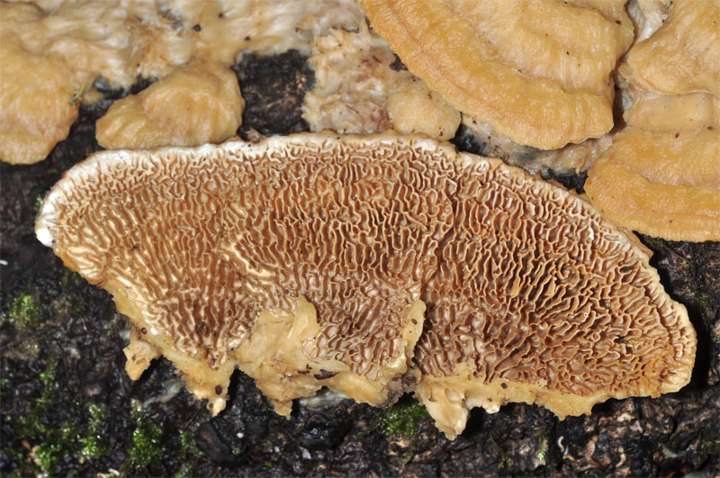 | | L'aspetto macroscopico della specie non mi ricorda Trametopsis cervina perché gli esemplari che ho visto io (pochi) hanno una superficie sterile feltrata mentre nelle foto appare liscia e quasi viscida (questo aspetto é forse dovuto all'attacco da parte dell'ifomicete?). Inoltre la superficie poroide in Trametopsis cervina é irregolarmente poroide fino ad essere odontioide ma non so se può essere dedaleiforme come appare nella foto. |