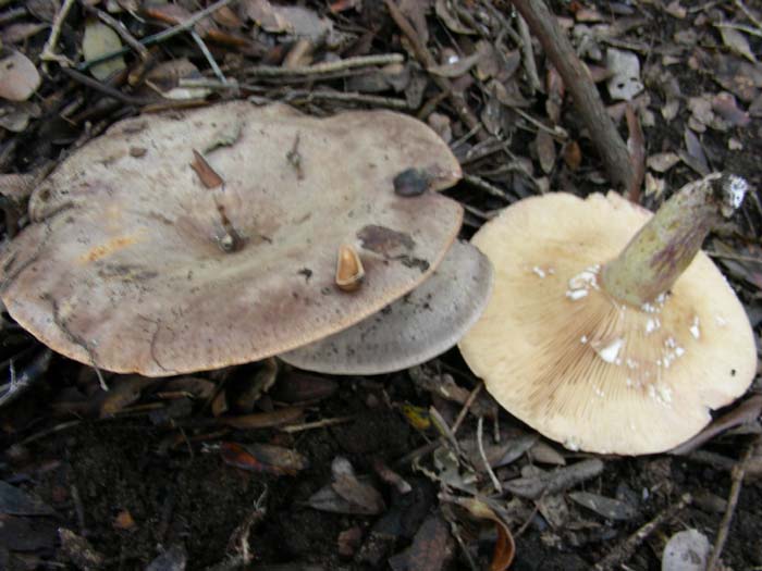 Come al solito Antonio è in effetti avaro di particolari, comunque direi che il primo lattario mostra lattice virante al viola (evidente sul gambo dell'esemplare a destra), quindi, dato, l'habitat, potrebbe essere Lactarius luridus.