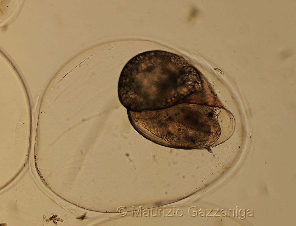 Uovo di lumaca rinvenuto, insieme ad una quindicina d'altri, tra le alghe in un mio acquario. Microscopio CX-41, obiettivo 10X.