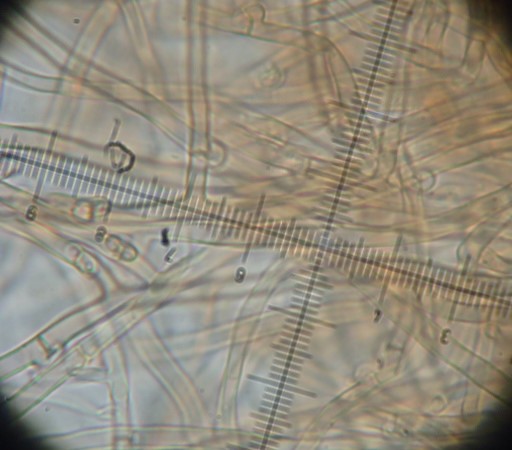 Ciao Salvia! con questi gloeocistidi e le spore amiloidi e dalla superficie asperulata direi che può essere solo lui. Complimenti per lo studio accurato! |