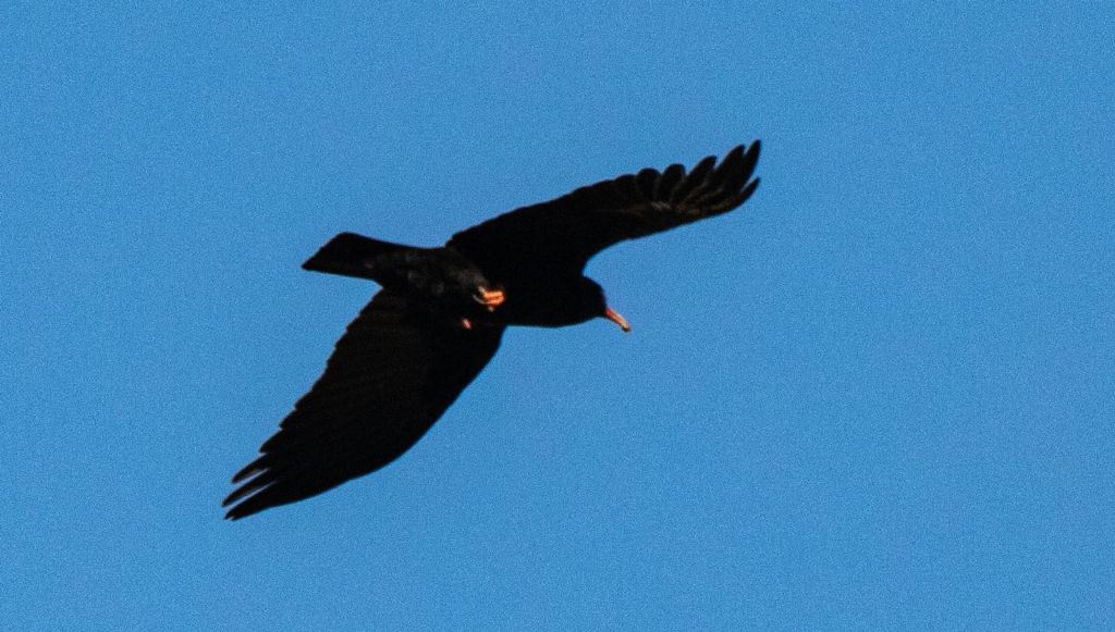 Erano 2 individui che si spostavano in coppia. Confrontando la foto con il manuale, mi sembra di vedere un becco rossastro e coda più corta della proiezione delle ali. Anche il verso differisce da quello indicato per il gracchio alpino quindi posso pensare al gracchio corallino anche se per il piacentino non è un avvistamento molto comune.